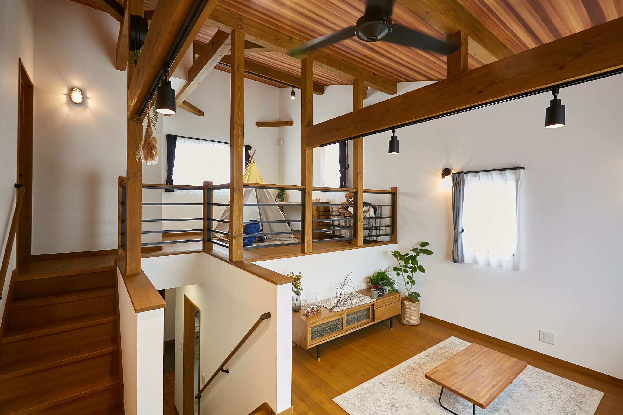 吹き抜けを通して光と風が家全体に行き渡り、